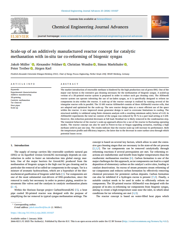 We are happy to announce that FAU published an open access paper titled “Scale-up of an additively manufactured reactor concept for catalytic methanation with in-situ tar co-reforming of biogenic syngas” in Chemical Engineering Journal Advances.